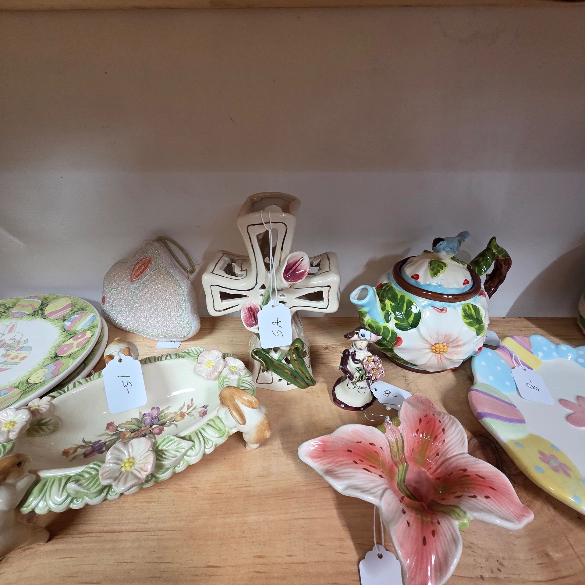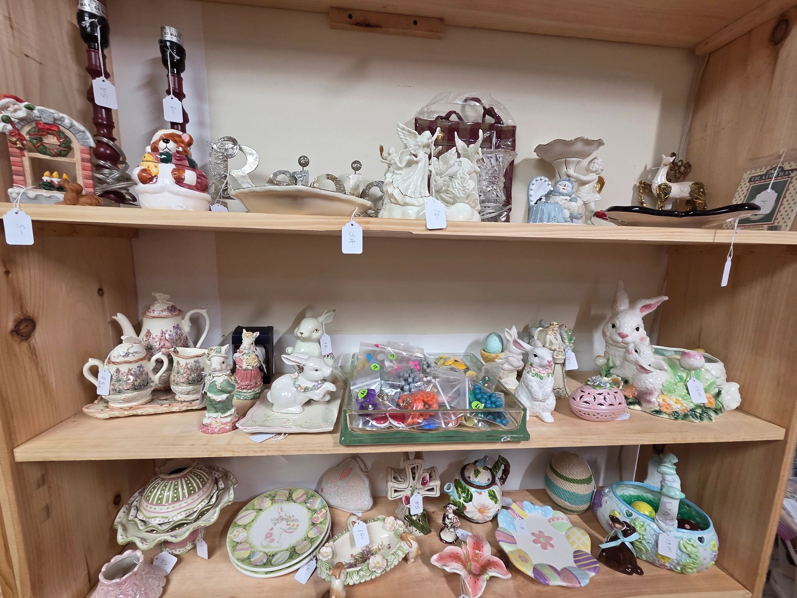 Sharon's shelf is a holiday collector's dream! If you are looking for a special piece to complete a certain Christmas or Easter collection, or maybe just looking for a stand alone piece to enhance your holiday decor, be sure to stop by Sharon's shelf! She also has a variety of jewelry sets by her shelf as well as a wooden jewelry display cabinet in the main entrance of the store. Among her holiday items, you can also find various home decor.